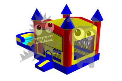 Another option for limited space is the COM-560 Castle Combo with Short Slide. It is the same 5-in-1 model as the Castle Combo, but the slide is straight instead of wavy and 4′ shorter than its predecessor. Includes bounce area, obstacles, climbing wall, waterslide, splashpool, and basketball hoop! Can be used wet or dry! This combo features a colorful color palette of yellow, red, and blue and has 3-D castle spires at all four corners of the bounce area! On the front of the unit is a Velcro panel that can accommodate any standard medium-sized art panel. Customize the combo to fit any themed celebration.
